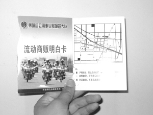 ??? 本報訊??“有了明白卡,知道在哪條路可以經營,俺再也不用擔驚受怕地與城管捉迷藏了。”12月2日,鄲城縣公用事業局向全縣2000多個流動商販每人發放一張“流動商販明白卡”,卡上清楚地標明30多條可以流動經營的街道、兩條嚴禁經營的街道和部分限時經營的街道,商販一目了然,反應良好。
