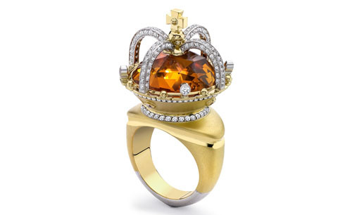 Theo Fennell善于找樂子,這一次,他對風靡全球、大受追崇的皇室婚禮排場表示不屑。對于那些自我感覺配得上金光閃閃的皇室珠寶的人們而言,Theo Fennell提供了皇冠戒指系列供其選擇。對Theo Fennell來說,每件珠寶杰作均是為那些崇尚趣味性以及青睞傳統的人們精心打造的。這些珠寶比茶巾或婚禮杯更有品味。