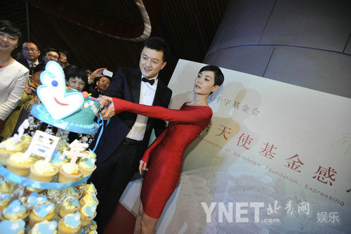 王菲一襲紅裙艷麗撐場,與李亞鵬攜手切下特制的蛋糕