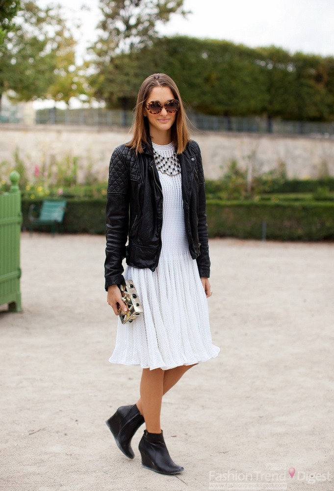 1. 將黑色夾克搭配一件小白裙上,腳穿一雙契型小裸靴,同時增加脖間的配飾和一款精致的手包,當然一款豹紋的墨鏡也非常有時尚感