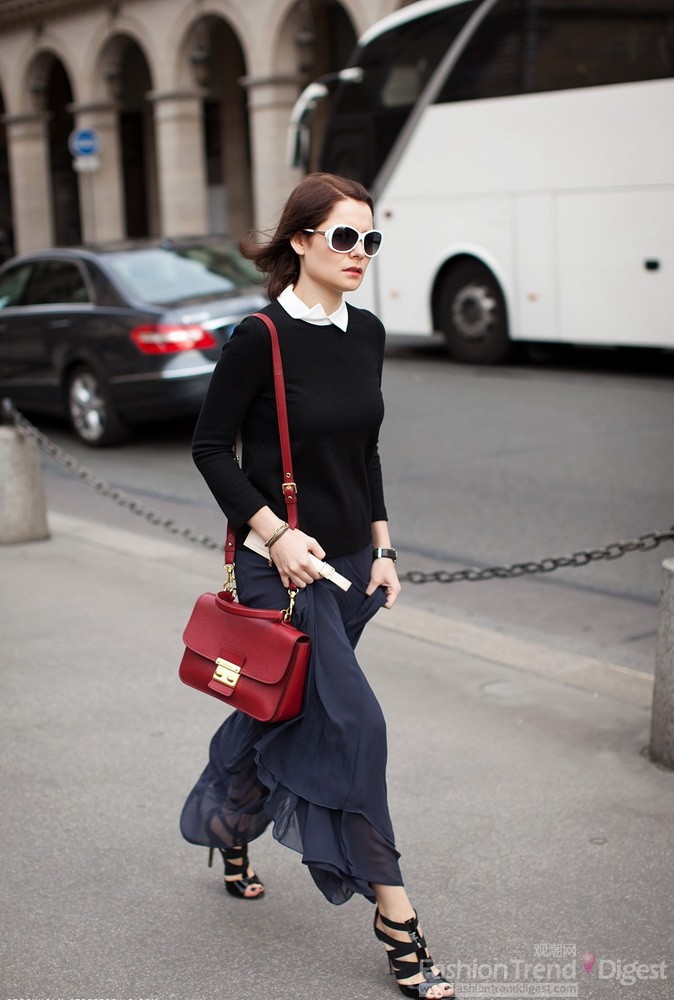 2. 疊穿也很有新意,只需要一款白色襯衣打底,外套黑色毛衣或者圓領衫,下身你可以選擇藍色雪紡裙,同時墨鏡的鏡框要和身體某個部位的顏色相呼應,如果想要更出彩,那就加上一個撞色包吧
