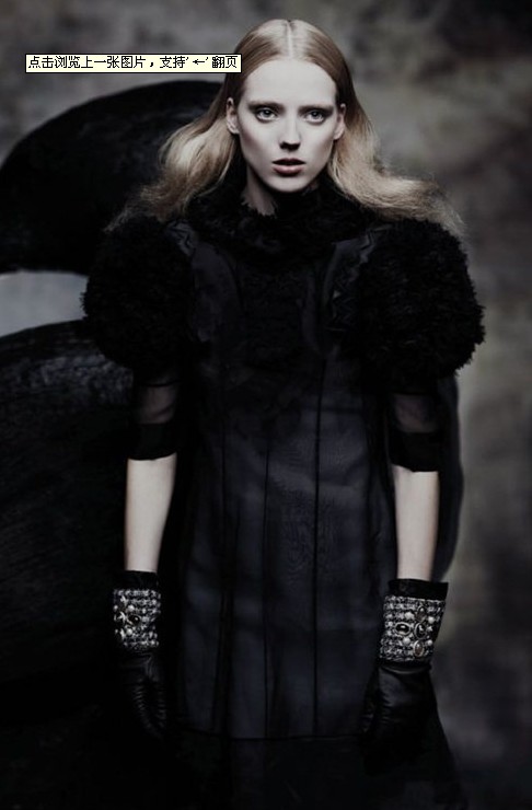 Chanel是個將黑色的美感發揚到極致的品牌,尤其是在當代攝影術的輔助下,這種美變得更加驚心動魄。某雜志以“詩意的奢侈Poetic Luxury”為題拍攝了這樣一組質感強烈的Chanel 2011秋冬季的新品,由攝影師Chris Nicholls掌鏡,強烈的對比和純凈的環境,都將黑白的Chanel時裝映襯得異常高貴動人