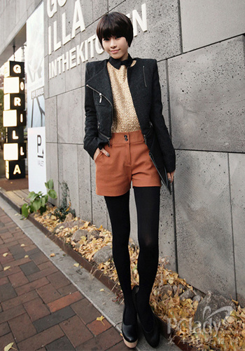 有些帥氣的小女人是男生格外傾心的一種:小尖領的金色內搭復古搭配橘色高腰短褲,黑色機車款聳肩外套帥氣加入,整體視覺感非常高挑,信封手包+松糕鞋,都是潮品!
