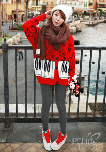 紅色復古鋼琴毛衣外套相當亮眼,深灰色補丁打底褲是當季熱門單品,白色高幫板鞋有了紅色鞋帶的搭配巧妙和毛衣呼應,圍巾則選擇了鐵紅色,能遮蓋一些毛衣的刺眼緩和整體色調。