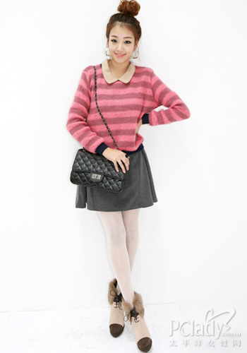 粉色必然是約會最佳選擇,條紋拼色的毛衣里面搭配了裸色復古圓領襯衫,搭配上灰色短裙,包包頭的發型襯托下可愛度馬上提升,皮草裝飾的短靴和襯衫呼應,鏈條包包斜跨也是很不錯的搭配。