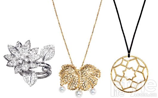 ??? Van Cleef & Arpels Lotus指間戒 這是一款引用鉆石花向珍珠求愛的美麗傳說的戒指。象征忠貞愛情的繡線菊,輕巧依偎在指間的模樣,怎能不惹人憐愛?! TASAKI香堤堡蕾絲吊墜 清晨的露珠還停留在葉子之上,那葉片如手掌,你我相牽。 Tiffany&Co. 18K金吊墜配黑絲繩 如蓮花般的盛開,輕盈雅致