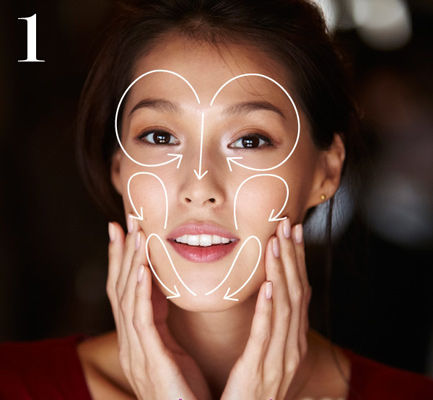 取小顆珍珠量的乳霜,在手心勻開后,以雙手指腹沾取,從下巴開始向上劃圈涂抹,直到質地完全被肌膚吸收