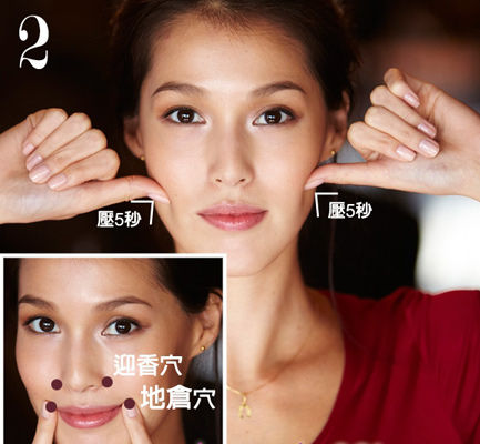 以拇指按壓顴骨下方凹陷處,數5秒后放開,重復3次,促進臉部血液循環。也可以食指按壓鼻翼及嘴角穴道,加碼活絡血循