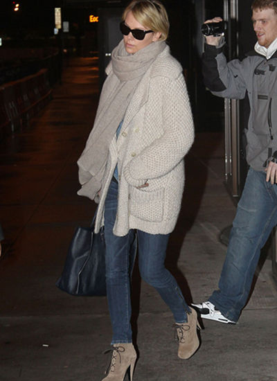 粗棒針毛衣外套,顯得十分厚實。溫暖,加上大大的圍巾,十分有冬天的感覺,拉鏈設計的小腳褲更有亮點,搭配復古短靴,時尚中帶著復古情懷