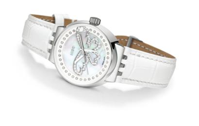 整體的白色設計和銀色的金屬表框,營造出一個冰與雪的世界。珍珠貝母的表盤中央,向右裝飾著59顆鉆石鑲嵌成的蝴蝶造型,與表盤外圈的39顆鉆石相互呼應,優雅、精致而浪漫,仿佛是從安徒生《冰雪皇后》中翩然飛出的純美精靈。設計師將反光藍寶石鏡面運用在表殼與表背,精雕細作的自動機芯和自動陀透過透明背底一覽無遺;搭載具有40小時動力儲存的自動上鏈機芯,具備100米的防水深度