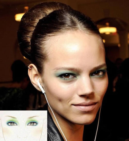 先以綠色大面積暈染眼部,再于貼近眼皮的地方用眼影刷均勻刷上藍色眼影。注意不要忽略下眼皮