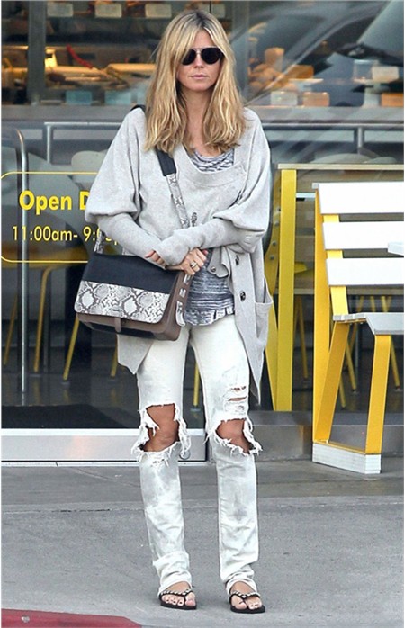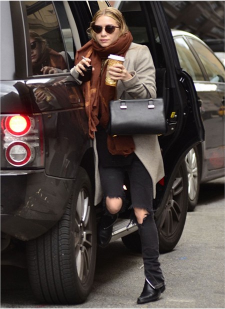 時尚解析:大大的破洞,膝蓋都跑出來了,然而上身則是大衣和大圍巾,小腳部分還有拉鏈設計,搭配男性化的皮鞋,超級有范兒
