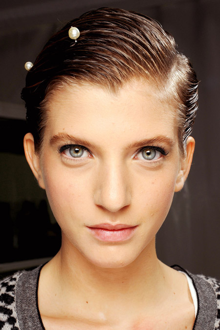 ??? 香奈兒 (Chanel) 2012春夏巴黎時裝周秀場上,彩妝師Peter Philips 把妝容重點放在光澤上,體現出唯美純凈和淡淡的奢華,與裝點的施華洛世奇半圓形珍珠相映生輝。他用白皙又有光澤的底妝配上了粉色珊瑚色的腮紅,濕潤并微閃光澤的眼影,最后以黑色的眼線收尾。嘴唇上也帶著微微的珠光,最亮的只有粉色唇彩和被貼在模特的眉毛、耳朵和鼻側,或者濕潤的頭發上的白色珍珠。