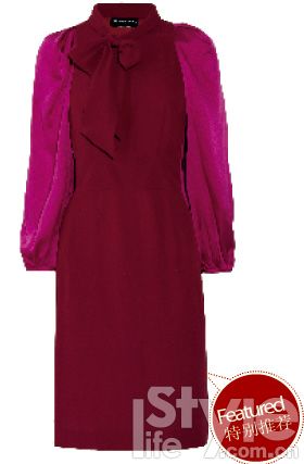 不用多說,拼色已經是強調數次的流行主題。深沉的紅色不會過于夸張,而拼接的桃紅色袖子又不讓你流于平淡!
