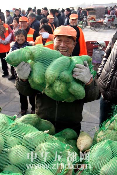 當天上午,淮陽縣太昊陵廣場人頭攢動,1000余名貧困家庭代表早早地來到現場等候。9時許,“愛心蘿卜”開始免費發放。僅一上午時間,20萬斤蘿卜就被認領一空。