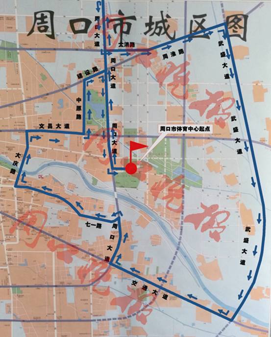 ????賽事初步確定報名參賽總人數為1萬人,其中,全程馬拉松2000人,半程馬拉松2000人,迷你馬拉松6000人。比賽路線(如圖)暫定為:市體育中心(起點)——周口大道——北高速口轉折——太清路——周淮路——武盛大道——周項路——周口大道——七一路——大慶路——文昌大道——中原路——建設路——周口大道——市體育中心(終點)。