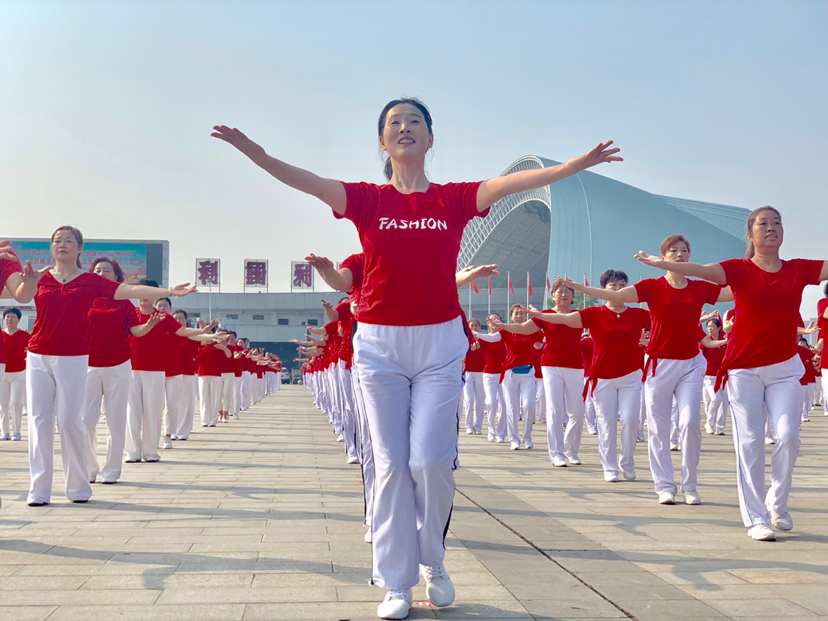 在活動現(xiàn)場,身穿紅色上衣,白色長褲的廣場舞愛好者隨著音響里傳來的指令,面帶笑意舞動著。