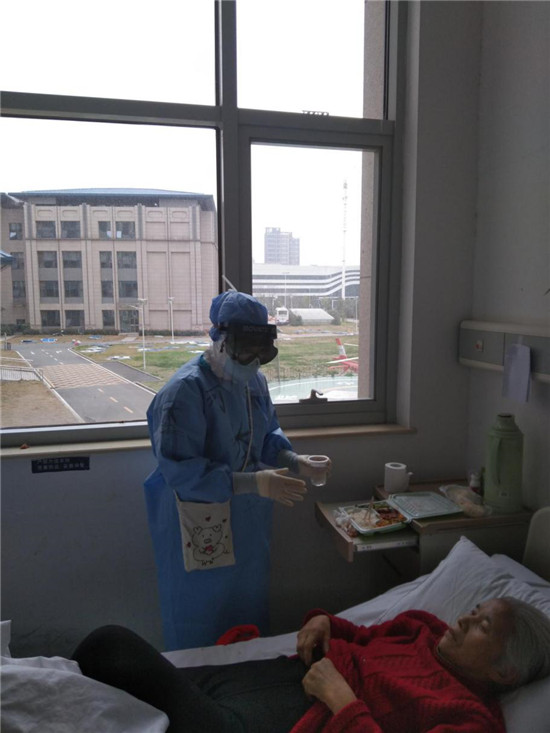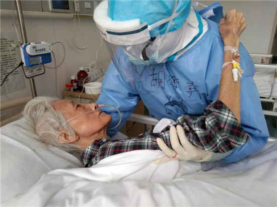這位老人名叫楊守振,今年84歲,不僅感染新冠肺炎,而且有嚴重的營養不良,插著胃管,身體極為消瘦,生活不能自理。為了不讓老人出現壓瘡,胡奔奔需要每隔一個小時為老人翻一次身。翻身時候,為了讓老人更舒服一點,她每次都像抱孩子一樣把老人抱在懷里,動作輕柔的按摩老人受壓的部位防止壓瘡的形成。貼心照顧之下,老人身體狀況和精神逐漸好轉,每次跟家人視頻聊天的時候,老人都會指著幫她舉著手機的胡奔奔朝手機里的家人顫顫巍巍的豎起大拇指。