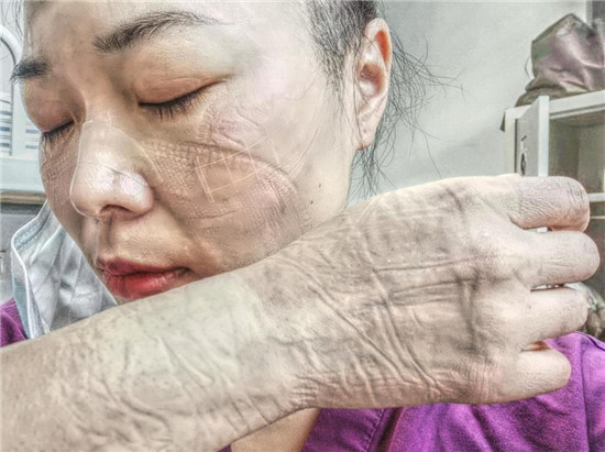 因為新冠肺炎的強傳染性,胡奔奔每次去病區上班都要全副武裝,而且為保證在6個小時的工作時間內不被暴露,不能去衛生間,不能喝水,還要穿上成人紙尿褲以防萬一。這樣下來,汗濕衣服是常事,而且下班后脫掉防護裝備后,她原本清秀白皙的臉上,滿是深深的皺褶,久久難以恢復,惹人心疼。給家人報平安時,胡奔奔甚至不敢視頻聊天,只能語音安慰家人。