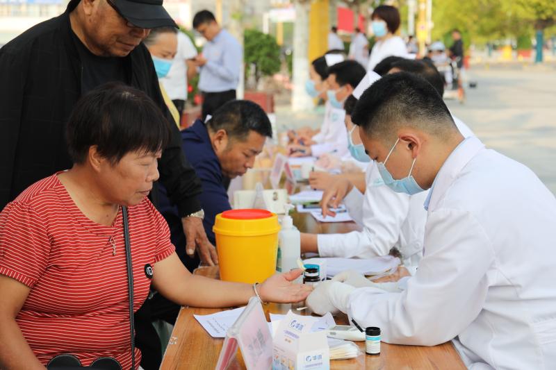 義診活動現場,通過懸掛主題宣傳橫幅、擺放健康知識宣傳展板、設置義診咨詢服務臺、發放健康促進宣傳折頁等方式為群眾進行健康知識宣教。前來咨詢就診的群眾絡繹不絕,醫務人員熱情地為群眾提供免費測量血壓、血糖等服務,耐心細致地解答群眾健康咨詢并給予診療建議,提醒平時多多加強鍛煉,注意健康飲食。