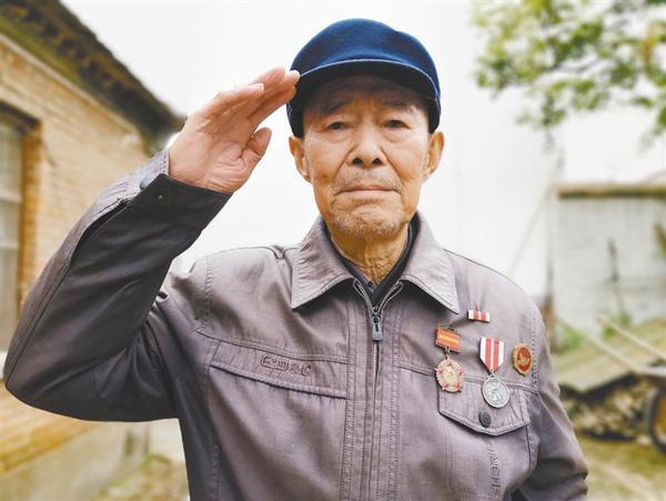 聽說記者要為他照相,老人立即要求家人為他換身干凈的衣服,很認(rèn)真地把軍功章、獎(jiǎng)?wù)乱灰淮髟谏砩希p腿合攏,努力地挺直上身,對著鏡頭打了一個(gè)標(biāo)準(zhǔn)的敬禮。