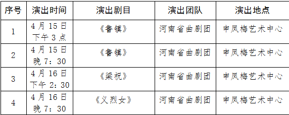 4月15日至16日,“中原文化大舞臺”在周口市安排4場經典劇目演出。具體安排如下: