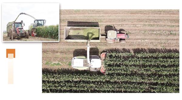 金秋時節,田野里一片繁忙景象。在沈丘縣的一片農田里,一臺大型青貯玉米收獲機精準地將玉米秸稈連同果穗一同卷入機器。經過粉碎、壓實,玉米秸稈變身青貯飼料被輸送到隨行的運輸車里。