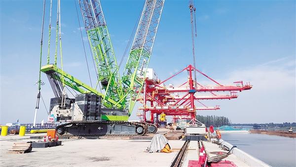 秋雨初霽,10月22日的周口港小集作業(yè)區(qū)碼頭顯得格外敞亮。堆場6臺高高的場橋(龍門起重機)如塔聳立,一灣碧水映襯著碼頭上的4臺橘紅色岸橋(集裝箱起重機),大港氣勢令人仰視。