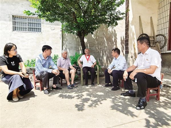 7月1日,沈丘縣付井鎮老黨員楊井明(右三)佩戴“光榮在黨50年”紀念章,為前來看望他的鎮村黨員干部講黨史。據了解,1968年7月1日,楊井明正式成為一名中國共產黨黨員。
